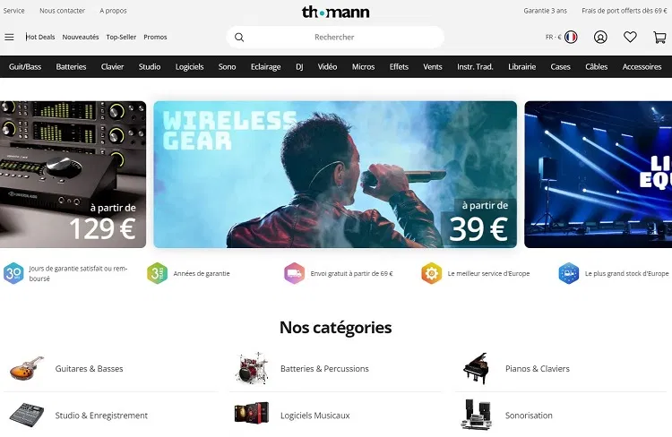 La force de Thomann réside dans leur grande capacité de stockage, ce qui leur permet de proposer de nombreux modèles différents et des gammes allant des instruments les moins chers (fabriqués à la chaîne en Chine) à ceux les plus performants et finement réalisés (fabriqués individuellement par des luthiers allemands).